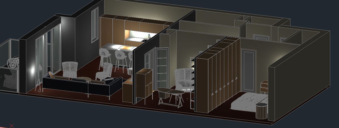 Noch eine 3D Visualisierung von Vorne. Mit der Terrasse, dem offenen Wohnraum, dem Studio und dem Schlafzimmer.